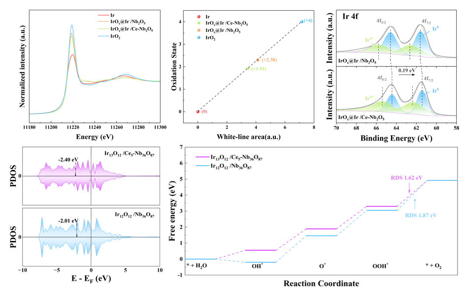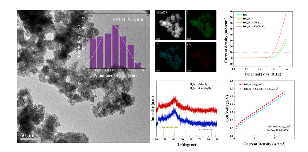 中科院上海高等研究院楊輝研究員團(tuán)隊(duì)與寧波中科科創(chuàng)研發(fā)團(tuán)隊(duì)通過在Nb2O5載體材料均勻引入微量Ce原子,并表面負(fù)載超小IrOx顆粒 (<2 nm),構(gòu)建一種具備強(qiáng)“金屬氧化物-載體”相互作用的負(fù)載型Ir基催化劑(IrOx@Ir/Ce-Nb2O5)。于載體材料中進(jìn)行Ce原子摻雜,既提升載體與活性中心間的電子轉(zhuǎn)移能力,同時(shí)保證Ir/IrOx活性材料的晶格完整性,避免催化活性快速衰減。該催化劑酸性析氧反應(yīng)過電位僅275 mV@10 mA cm-2,并在膜電極實(shí)際工況下表現(xiàn)出良好的活性與穩(wěn)定性,正持續(xù)檢測(cè)低載量下的長周期壽命(0.3 mgIr?cm-2)。