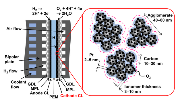 圖1. 質子交換膜燃料電池和催化層示意